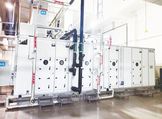 烟草加工车间普遍空间大、设备密集,空气流场复杂,如果风量不足易造成局部温湿度不均,影响烟丝含水率和品质一致性。环都拓普为此配置大风量HJK50U系列组合式空调机组,实现强劲送风与精准分区控制,使储丝房等大空间环境内的温湿度分布更加均匀稳定,通过优化气流组织与风压平衡,设备可在高负荷连续运行下依然保持送风均匀且恒温恒湿,显著提升烟草工艺稳定性与产品均匀性。