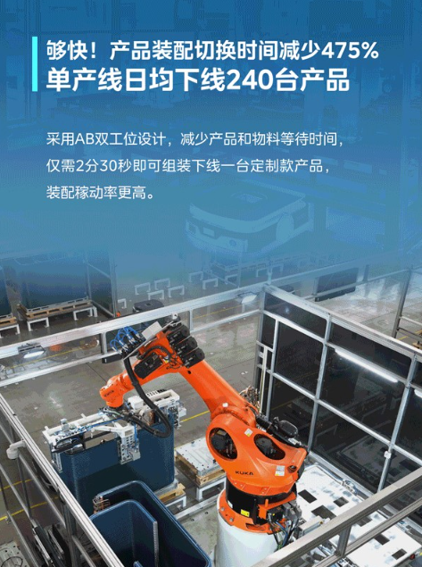 采用AB双工位创新设计,产品装配切换时间,减少475%,仅需2分30秒即可组装下线一台定制款产品,单产线平均日产240台。