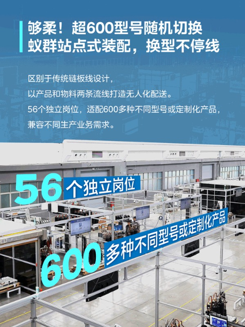 以产品和物料两条流线打造无人化配送,设立56个柔性岗位,可适配600多个不同型号的产品。