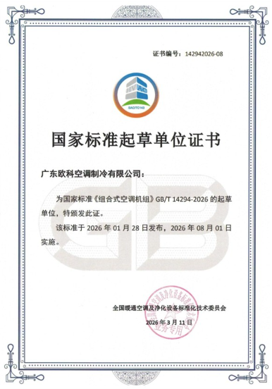 近年来,EK空调成功参与《组合式空调机组》GB/T14294-2026、23R203《制冷供热机房装配式设计与安装》图集、《热泵和冷水机组能效限定值及能效等级》GB 19577-2024、《数据中心蒸发冷却空调系统运维管理》T/DZJN 82—2022等一系列国家标准、行业标准、团体标准的编制工作,覆盖严寒地区热泵应用、畜禽养殖、数据中心等多个细分领域。