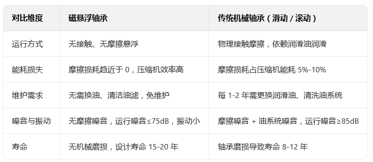 传统离心式机组的机械轴承依赖润滑油润滑与冷却,而磁悬浮轴承完全无需润滑油,两者对比显著: