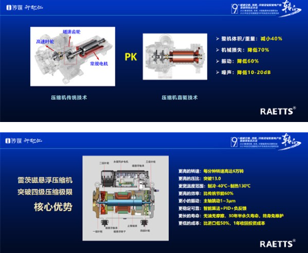 吴总提到,掌握了磁悬浮的核心和独家技术,才能让压缩机节能技术可靠稳定,雷茨重点研发的磁悬浮四级压缩机,突破行业瓶颈,超高压比大于13,转速突破6万,主轴无惧跌落,相比传统压缩机节能40-60%,成本相比进口机型降低50%,彻底颠覆传统的螺杆式老旧设备,广泛应用于南方供冷、北方供暖、速冻冷冻、热源替代、低压蒸汽、余热回收、干燥结晶、数据中心、制冰蓄能冷却等领域,具有持续节能,环境友好等性能优势。——这些技术优势,就是雷茨对于节能改造市场的价值贡献!