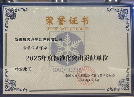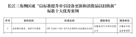 威灵汽车部件主要参与修订的国家标准GB/T 22068-2025《汽车空调用电动压缩机总成》被长三角三省一市市场监管局联合评为长江三角洲区域“以标准提升牵引设备更新和消费品以旧换新”标准十大优秀案例,被冷标委评为“年度十大新标准”。